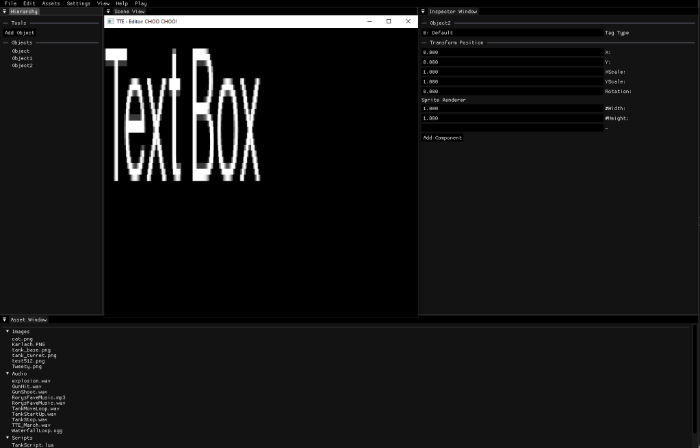 A small 2D game engine developed using C++ as part of a team project. Capable of basic physics, input detection, texture rendering, and support for scripting.